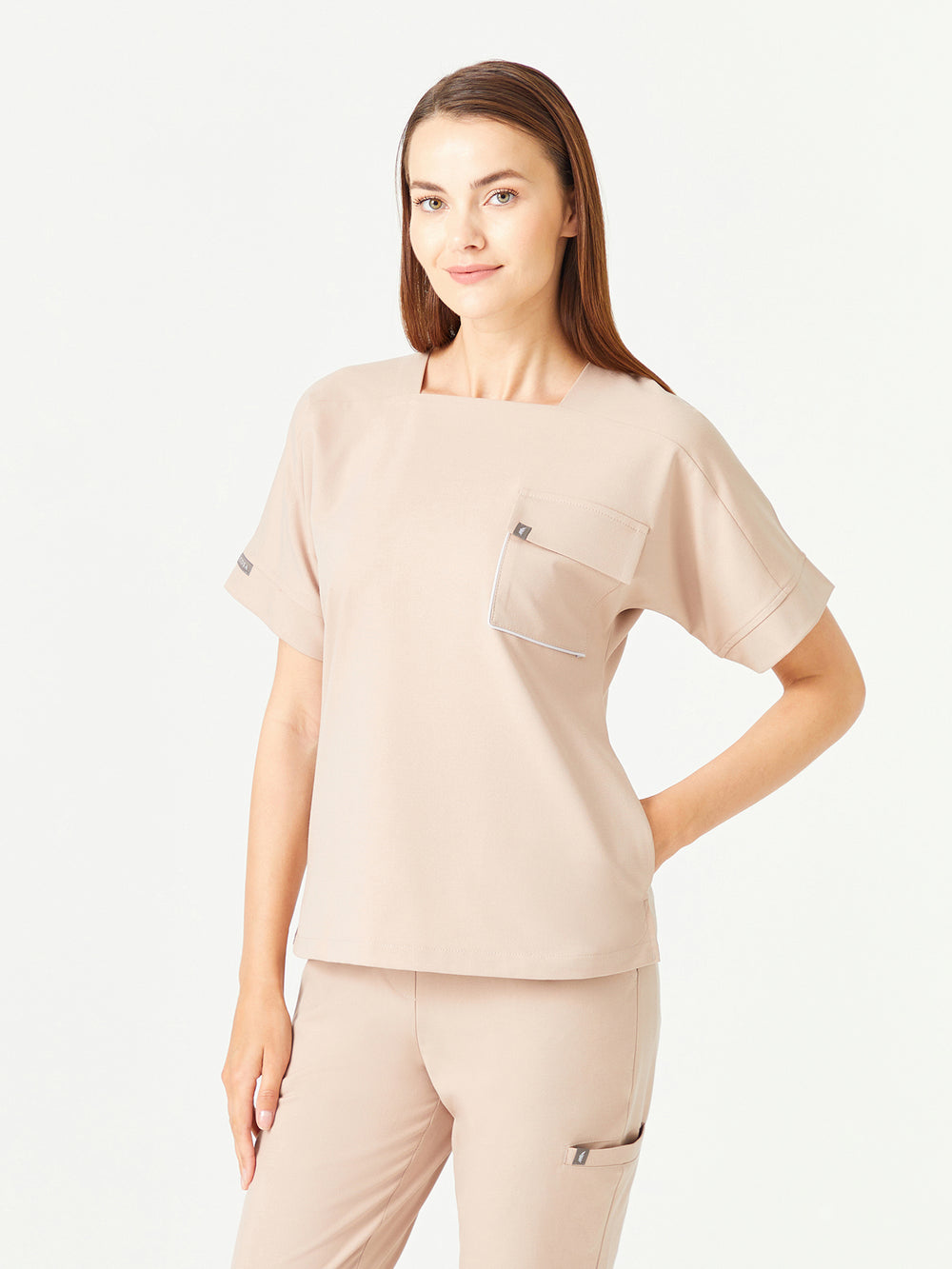 02 Kadın Kare Yaka Scrub Üst - Bej